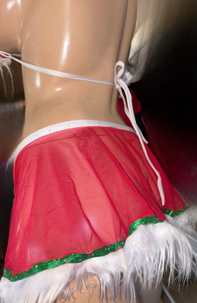 Bring festive charm to the stage with this sexy Holiday Skirt & Top Set. The micro triangle top features white feather trim and green sparkle edging for a playful Christmas look. The matching sheer red mesh skirt is trimmed with fluffy white feathers and green ribbon detailing, creating beautiful movement with every dance. Lightweight, stretchy, and perfect for holiday shows, themed club nights, and fun seasonal performances. Handmade in the USA.