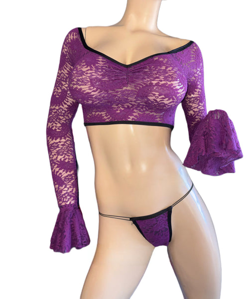 Sexy Magna color lace bell style sleeves top and thong . Size medium. Lycra spandex fabric lace .