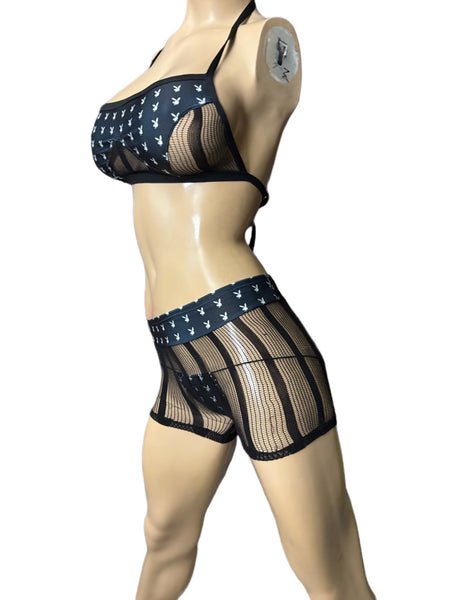 Sexy black Net shirt with white prints and top with net and print and matching thong. Size medium large