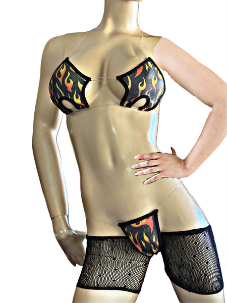 Sexy fire print top and thong with black Net short low cut style. Size medium large. Lycra spandex fabric