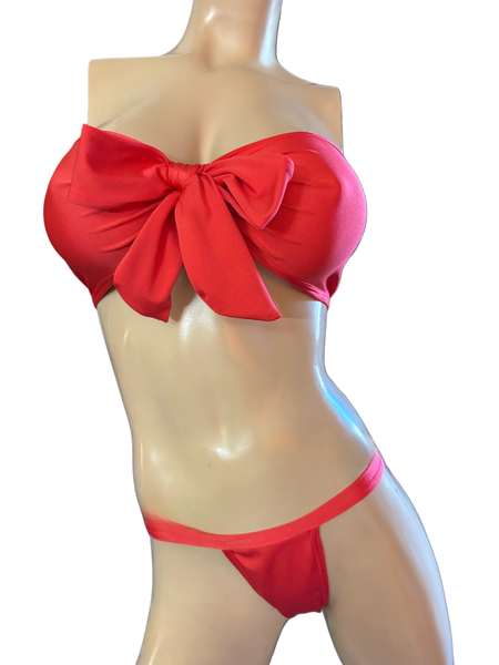 Sexy style top with bow tie and thong with bow back red Lycra spandex fabric. Size medium large. Made in America