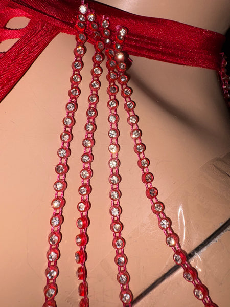 Sexy halter top with 4 road Cristal diamonds hanging from the shoulder both sides red Net and thong with clear elastic . Lycra spandex fabric. Made in America