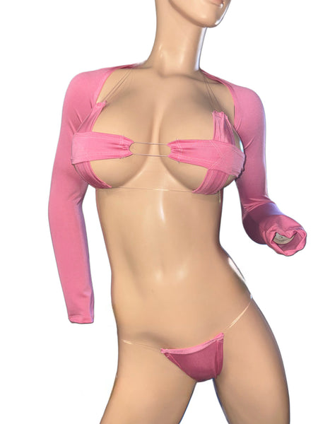 Turn heads in this striking pink exotic dance set designed for bold performance style. The outfit includes a long-sleeve shrug paired with a cross-cut micro bikini top for a dramatic, eye-catching silhouette. The matching thong features clear straps, creating a barely-there look that enhances movement and visual impact under club or stage lighting.