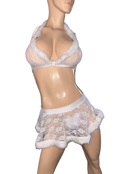 This medium-sized Exotic Dancer White Lace Skirt top and Thong set is sure to add a touch of sexiness to your wardrobe. Made in America with high-quality stretchy lace fabric, it features a flirtatious flair skirt with white fur accents and a matching white thong. Elevate your lingerie game with this alluring ensemble.