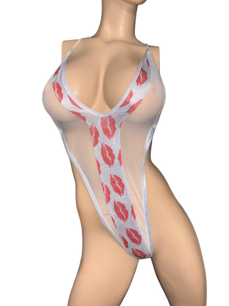 Sexy style bodysuit white mesh with lips kiss prints in the middle metallic silver trim . Size small medium.